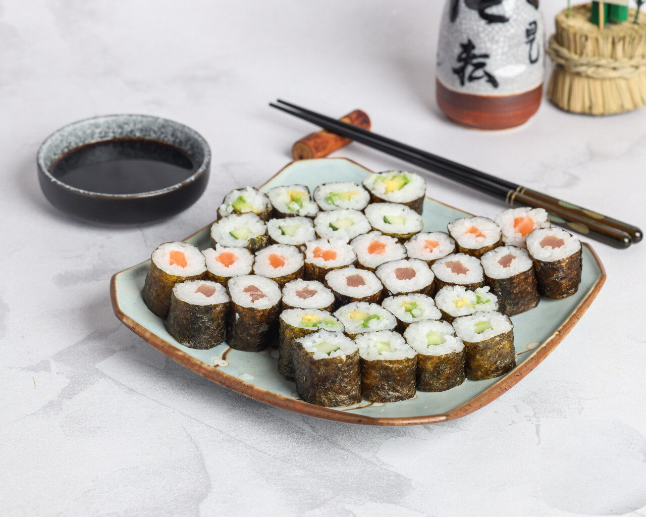 Includes: 8 pieces of salmon Roll, 8 pieces of Tuna Roll, 8 pieces of Cucumber Roll, 8 pieces of Avocado Roll.